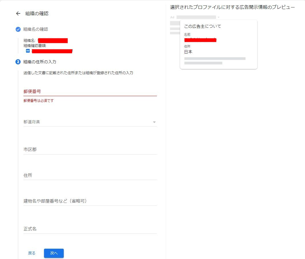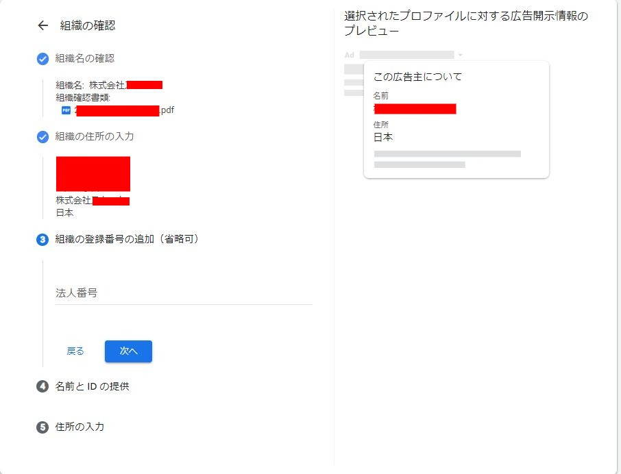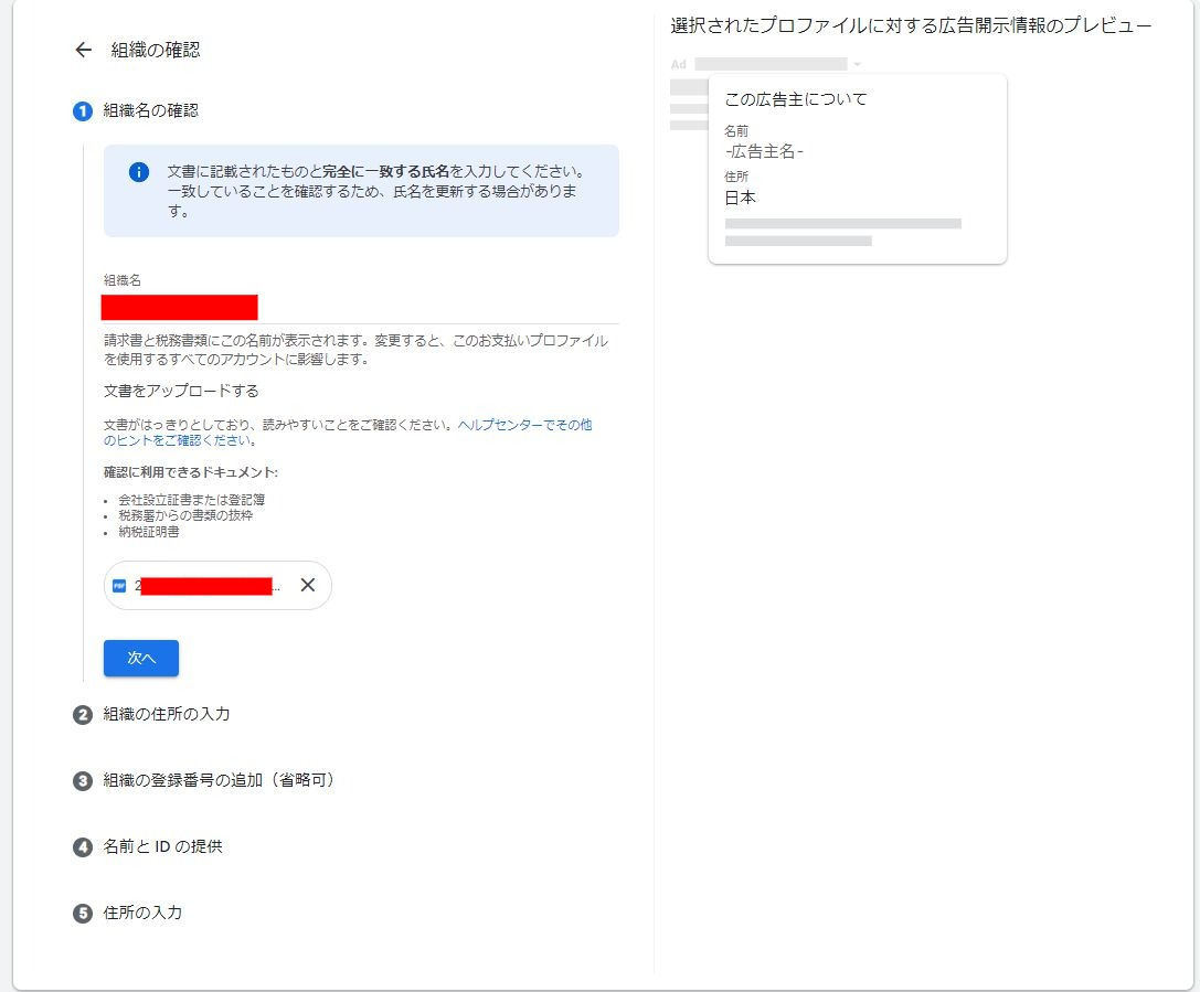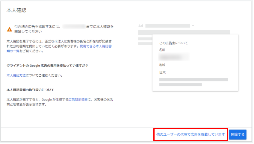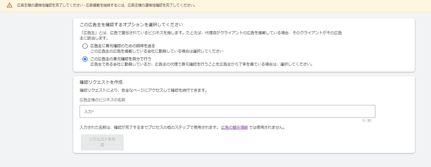 最終的に広告主の身元を確認し、開示情報に広告主名を正しく表示させたい場合には注意が必要です。