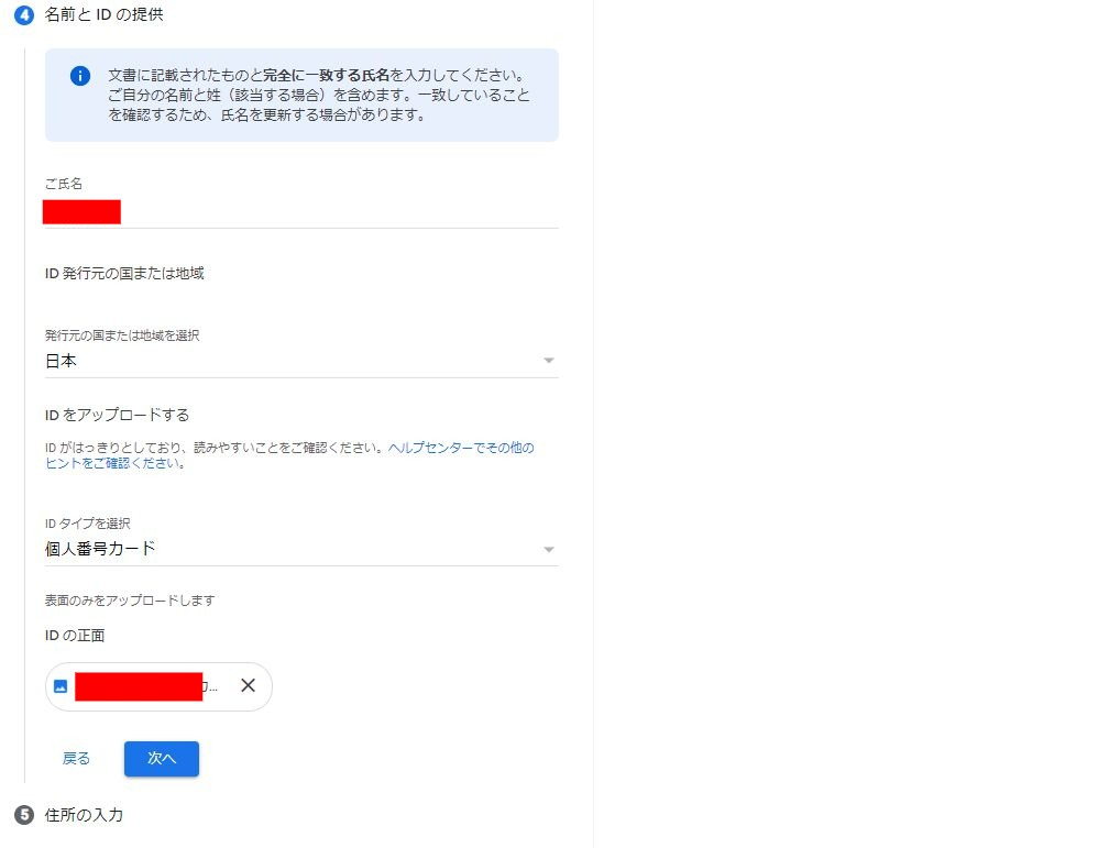 提出する確認書類に記載されている氏名をそのまま入力し、併せて確認書類をアップロードしてください。
