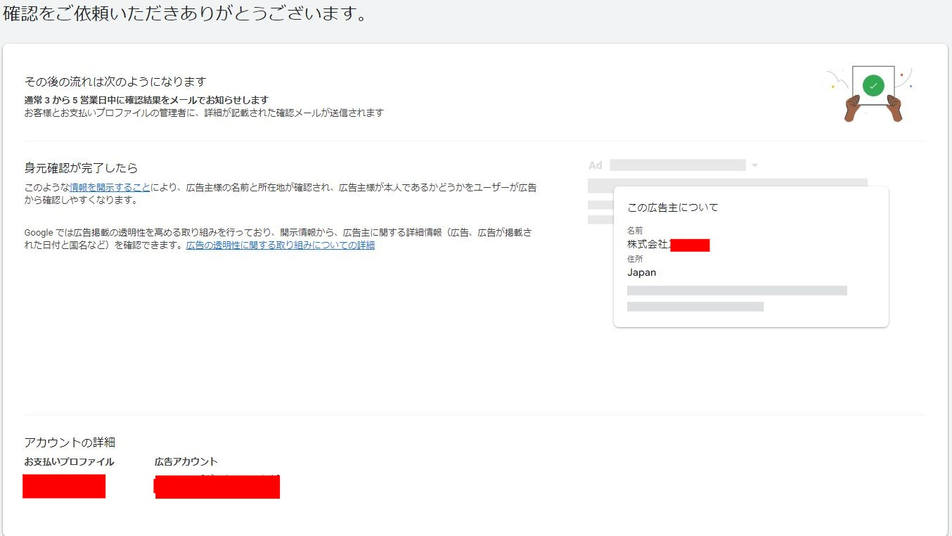 不備がある場合は、再度手続きをやり直す必要がありますが、問題がなければメールやGoogle広告の管理画面上で完了通知が届きます。
