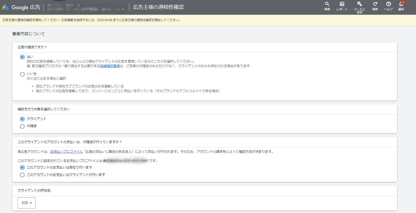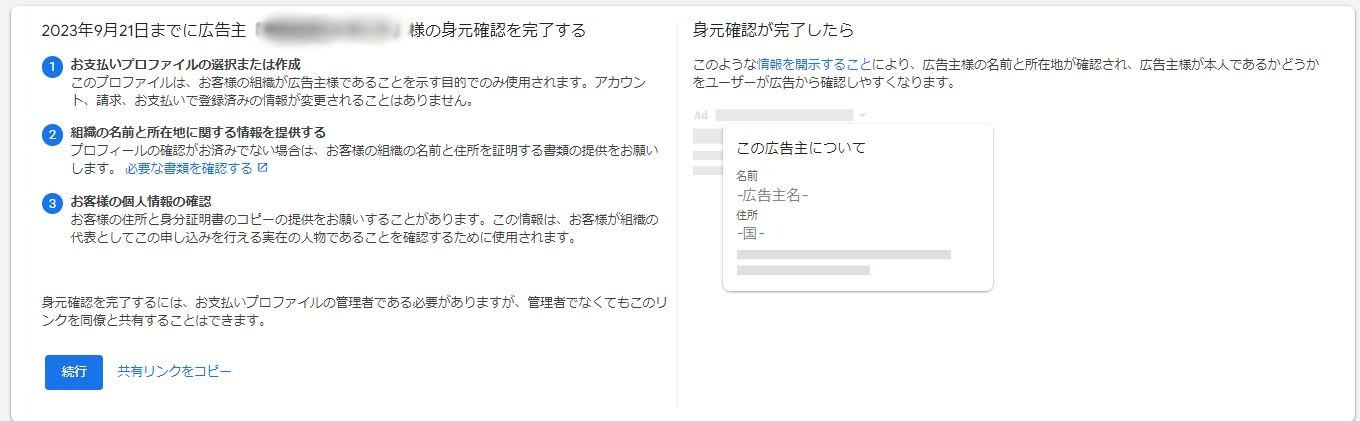 通知を受け取った際は、指定された期限内に「広告主の身元確認」を完了させる必要があります。