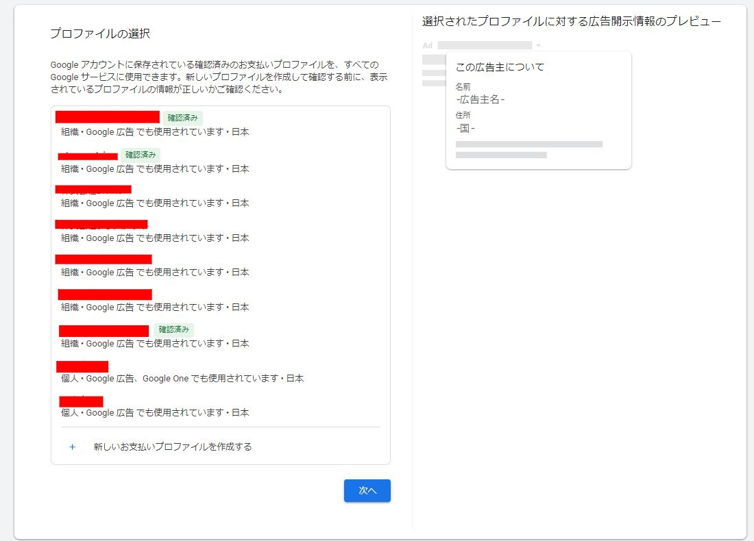 あくまで、本画面から作成するプロファイルは「広告主の身元確認の為のプロファイル」であり、既存の決済設定には影響しないとのことです。