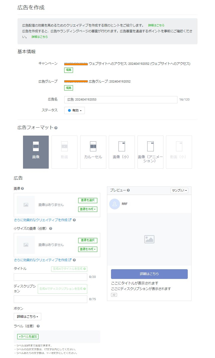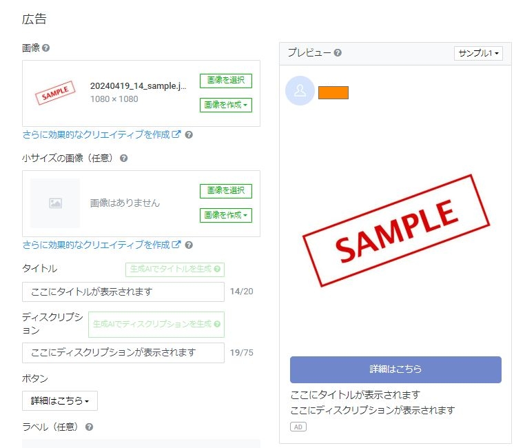 実際に画像を登録し、広告文を入力した状態が下記になります。