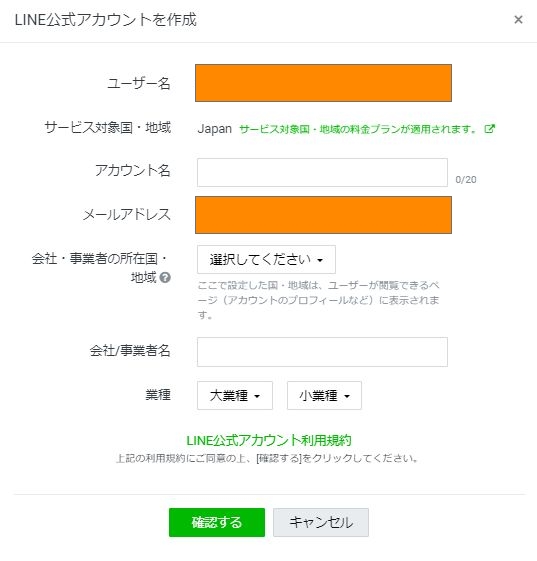 その場合、「LINE公式アカウントを作成」をクリックすると下記画面になるため、