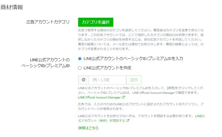 広告アカウントで実際に配信する予定の商材のカテゴリの選択と、広告配信に使うLINE公式アカウントの設定を行います。