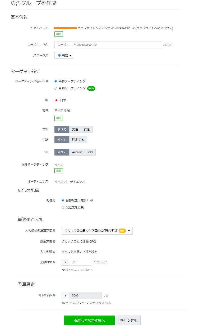 作成が初めてでターゲット設定が分らない場合はターゲティングモードを「自動ターゲティング」にすることで地域や性別などのユーザー情報設定以外はLINE側が自動でターゲティングし、配信を実行してくれます。