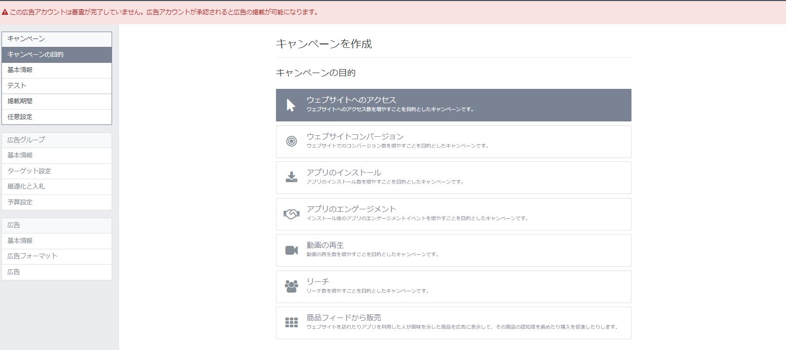 アカウントの審査終了後はカテゴリの変更ができなくなるため、違うカテゴリの商材を配信したい場合は別途広告アカウントの作成が必要となる場合もあります。