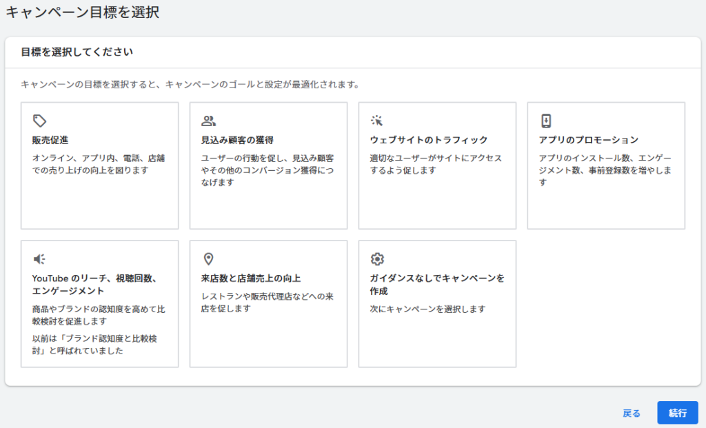 Google広告では、最初に広告の配信目的(キャンペーン目標)を設定します。