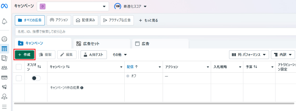「+作成」ボタンをクリックし、新しいキャンペーンを作成します。