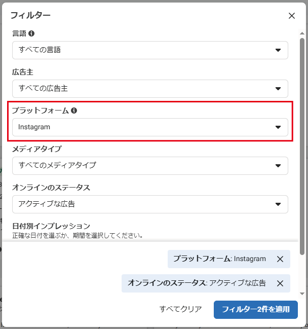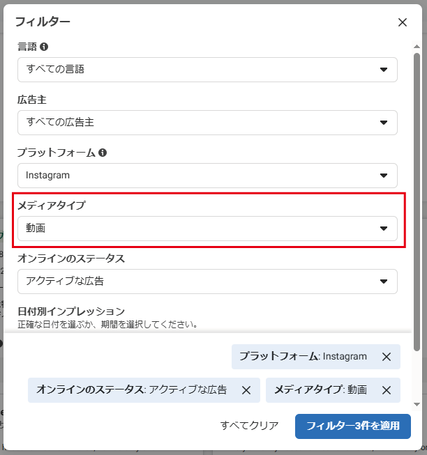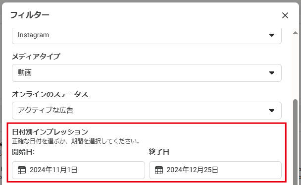 日付別インプレッションを設定することで、特定の期間に配信されたMeta広告を絞り込むことができます。