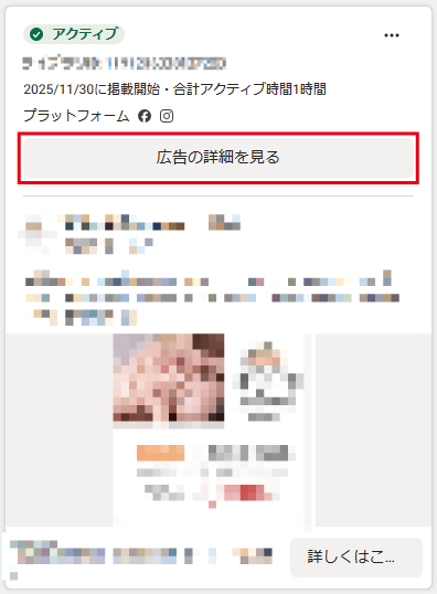 「広告の詳細を見る」などのボタンをクリックすると、Meta広告の詳細や広告主の情報を閲覧することができます。