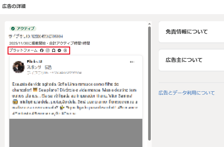 Meta広告の配信先プラットフォーム(SNS)も、Meta広告ライブラリで確認できる重要な情報です。