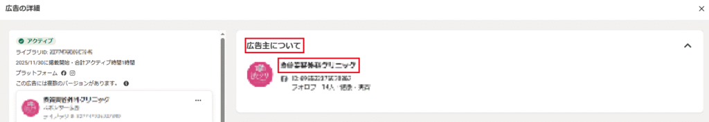 Meta広告ライブラリでは、Meta広告を配信している広告主の情報も確認できます。