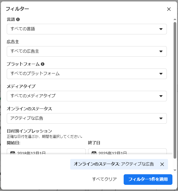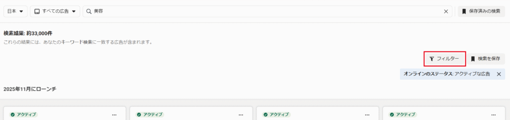 Meta広告ライブラリを効果的に活用するには、フィルター機能を使いこなすことが重要です。