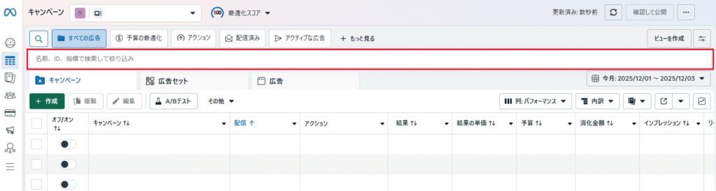 Meta広告マネージャでは通常、作成したすべてのキャンペーン、広告セット、広告が一覧で表示されます。