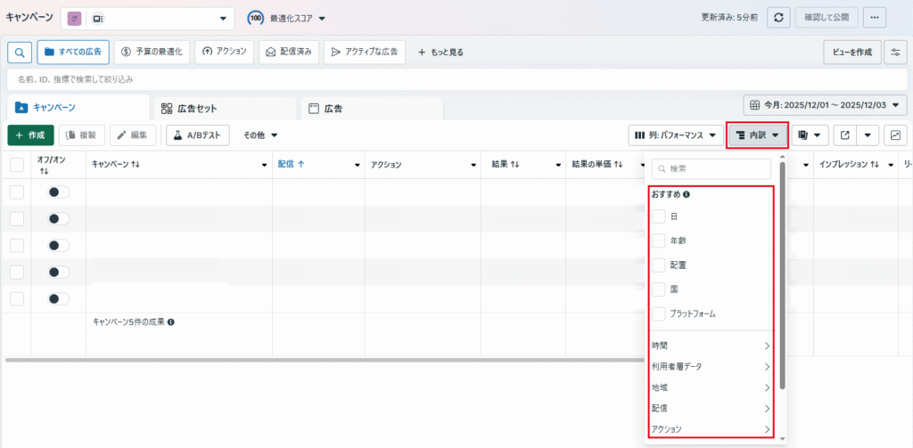 Meta広告マネージャ右上の「内訳」をクリックして、「利用者データ」「配信」などのカテゴリから選んだ項目別の数値を確認できます。