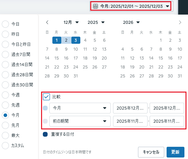Meta広告マネージャ右上の日付をクリックして、「今日」「昨日」「先月」などのプリセットに加え、任意の期間を設定することが可能です。