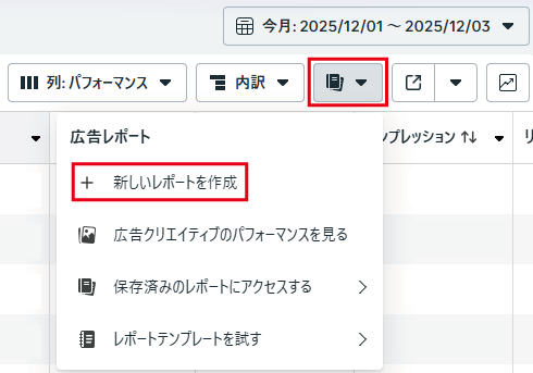 Meta広告マネージャ右上の「レポート」から「新しいレポートを作成」をクリックして、Meta広告のレポート画面にアクセスします。