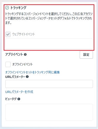 ウェブサイトへの遷移を促す目的の場合、広告の「トラッキング」で、設定済みのMetaピクセル(データセット)が選択されていることを確認します。