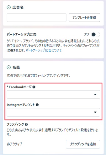 ここで選択したFacebookページやInstagramアカウントは、Meta広告に「広告主」として表示されます。