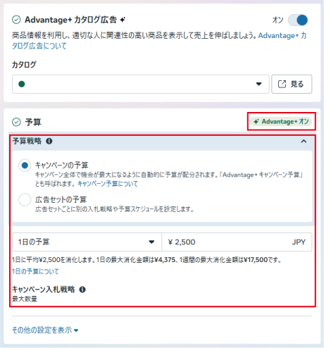 パフォーマンスを優先する場合、Meta公式は「キャンペーンの予算」を選択することを推奨しています。