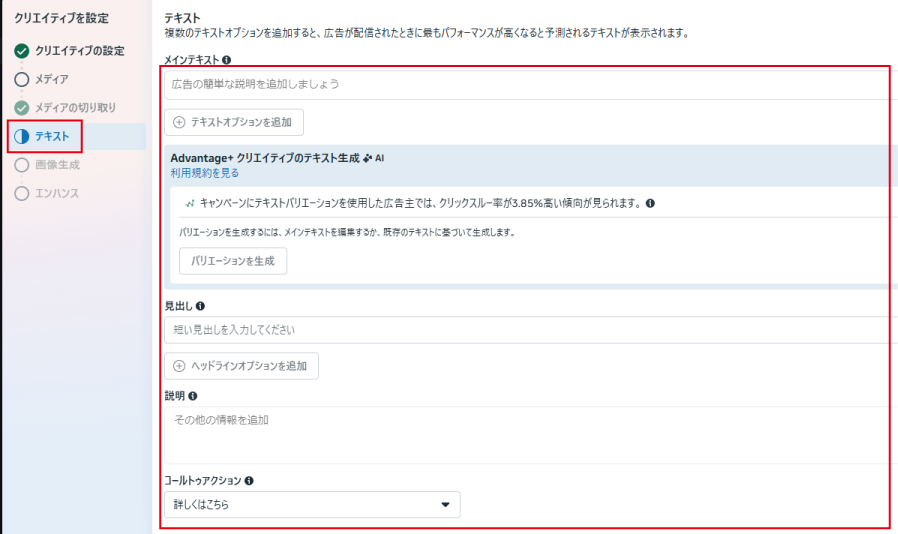 Meta広告として配信する画像や動画、テキストを設定します。