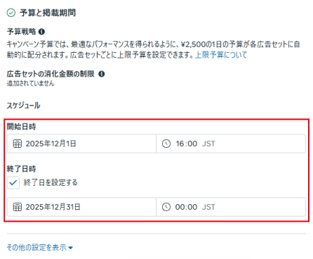 Meta広告を掲載するスケジュールを設定します。