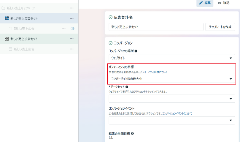 パフォーマンスの目標では、Meta広告のシステムが最適化する目標を設定します。