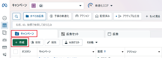 広告マネージャにアクセスし、「キャンペーン」タブから緑色の「作成」ボタンをクリックすると、キャンペーンの作成を開始できます。