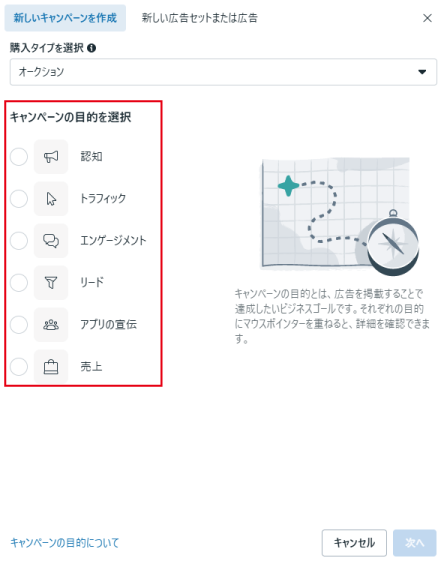 次にMeta広告の「目的」を選択します。